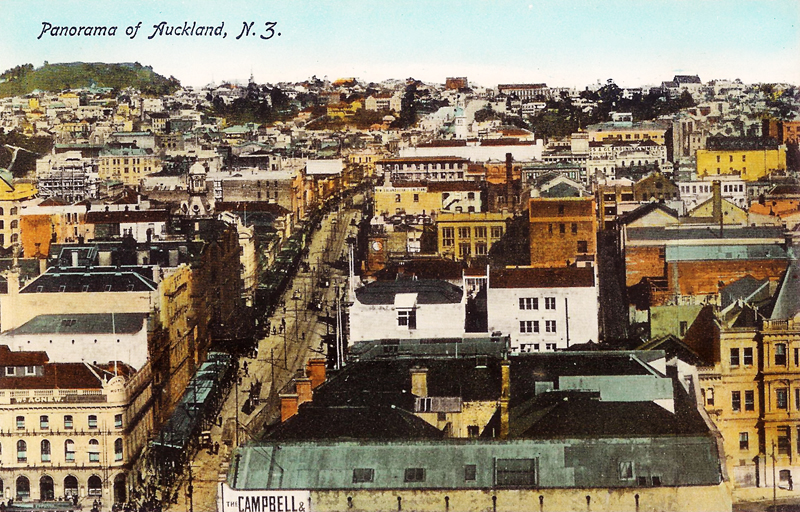 Looking south from Ferry Building over city to Mount Eden (left background), showing buildings in Queen Street (left of centre), premises of Thames Hotel, Campbell and Ehrenfried Company Limited and Customs Buildings (left to right, foreground)