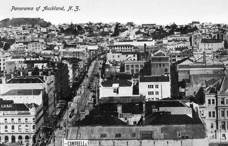 Looking south from Ferry Building over city to Mount Eden (left background), showing buildings in Queen Street (left of centre), premises of Thames Hotel, Campbell and Ehrenfried Company Limited and Customs Buildings (left to right, foreground)