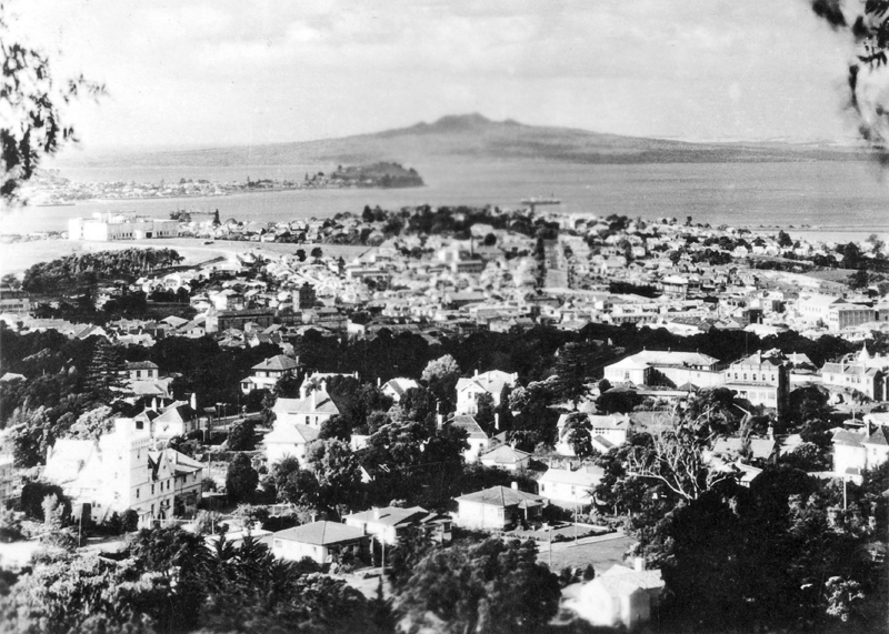 View from Mt Eden, with Devonport and Rangitoto Island in the distance