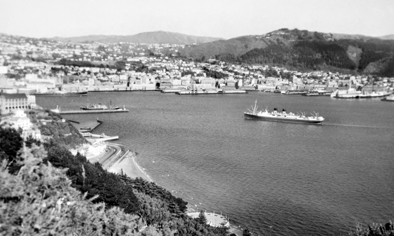 Wellington Harbour, with the trans-Tasman liner “Monowai” arriving, circa 1960